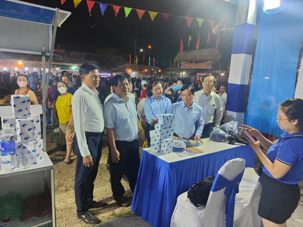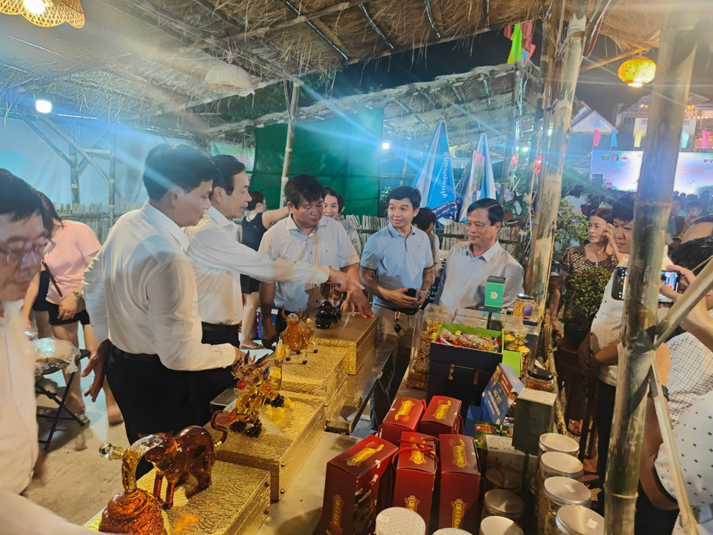 Ảnh: các đồng chí lãnh đạo, đại biểu tham dự tham quan các gian hàng tại Phiên chợ