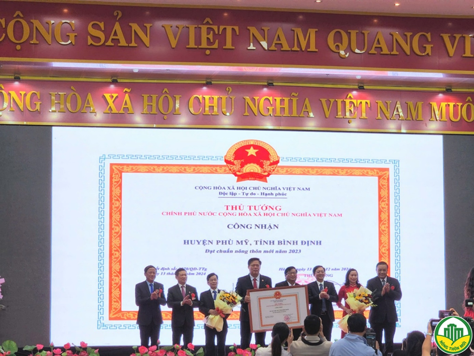 Phó Thủ tướng Chính phủ Hồ Đức Phớc (thứ hai bên trái) trao bằng công nhận và tặng hoa chúc mừng huyện Phù Mỹ đạt chuẩn NTM năm 2023