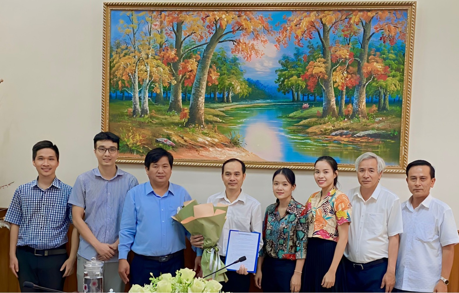 Giám đốc và Phó Giám đốc Sở Nông nghiệp và PTNT (ông Trần Văn Phúc - đứng thứ ba, từ trái sang; ông Hồ Đắc Chương đứng thứ bảy, từ trái sang) tặng hoa và trao quyết định, chúc mừng đồng chí Phan Thanh Tùng (đứng thứ tư, từ trái sang)