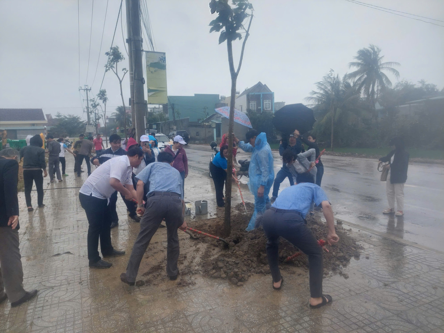 Tiếp nối hoạt động của chương trình, các đại biểu là Lãnh đạo tỉnh, Lãnh đạo huyện, Lãnh đạo xã và cán bộ Hội đã đồng loạt di chuyển ra phía dọc đường Cát Tiến - Diêm Vân để tiến hành hoạt động trồng cây. Hân hoan trong tinh thần “Vì lợi ích mười năm trồng cây, vì lợi ích trăm năm trồng người”, các bạn thanh niên xung kích, tình nguyện viên đã thể hiện ý chí quyết tâm “Đội mưa, thắng gió, vượt lên nghịch cảnh” chung sức chung tay với các chiến sĩ dân quân tự vệ của địa phương đã hăng hái phối hợp cùng đoàn đại biểu, mỗi người một tay vun trồng nên từng gốc cây cho “chiến dịch” lần này được “toàn thắng”. Mặc dù điều kiện thời tiết không thuận lợi, ai nấy đều lấm lem bùn đất nhưng tất cả mọi người vẫn đồng lòng, nỗ lực hết sức mình vì sự thành công của chương trình.